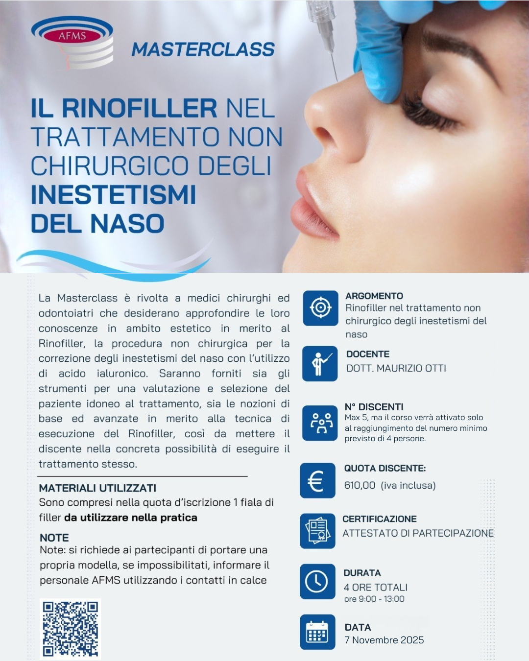 La Masterclass è rivolta a medici chirurghi ed odontoiatri che desiderano approfondire le loro conoscenze in ambito estetico in merito al Rinofiller, la procedura non chirurgica per la correzione degli inestetismi del naso con l’utilizzo di acido ialuronico.